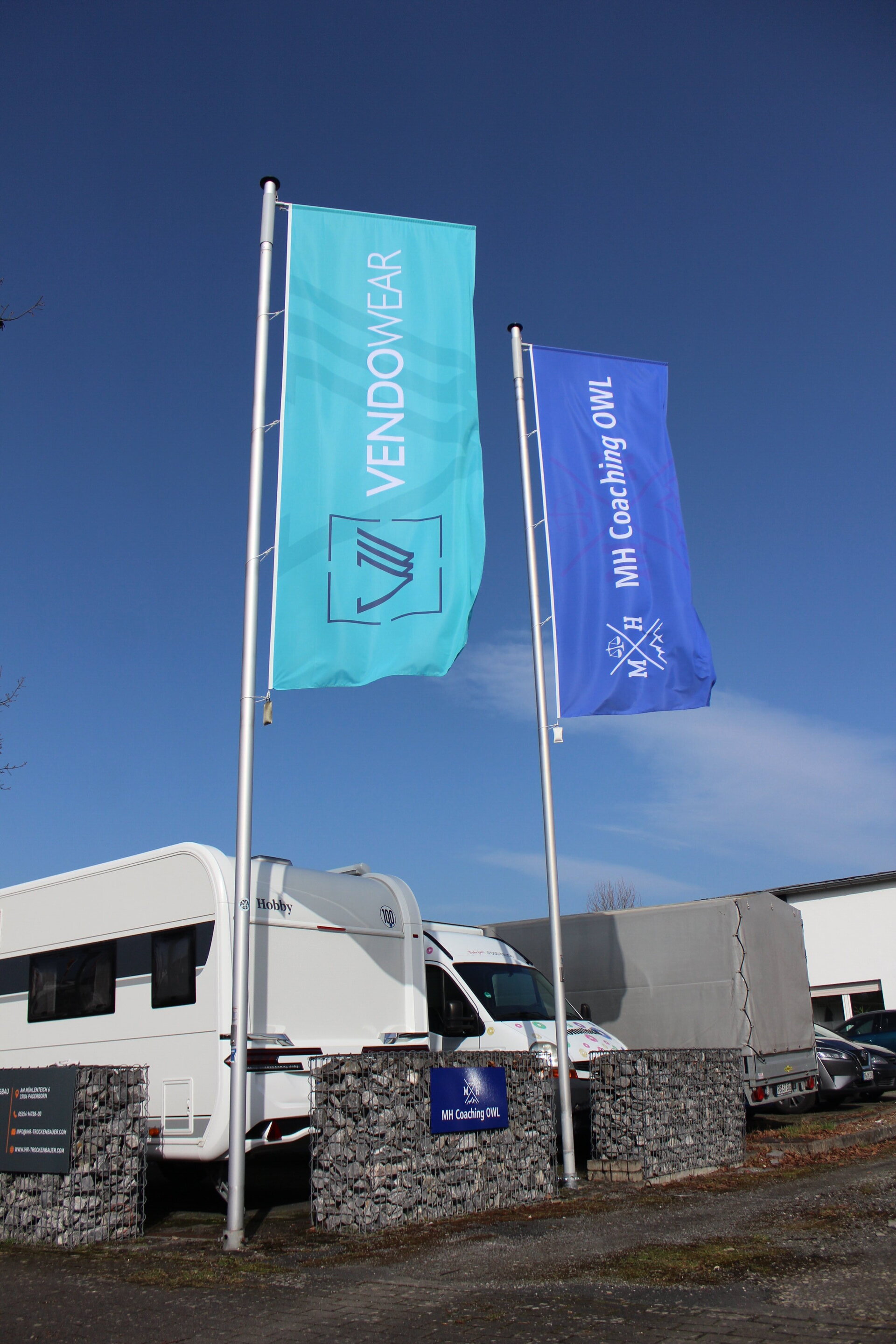 Bei unseren neuen Nachbarn haben wir in nur 1 Stunde einen zweiten Fahnenmast mit Schraubfundament montiert und die kräftig leuchtenden, schicken Fahnen gehisst.