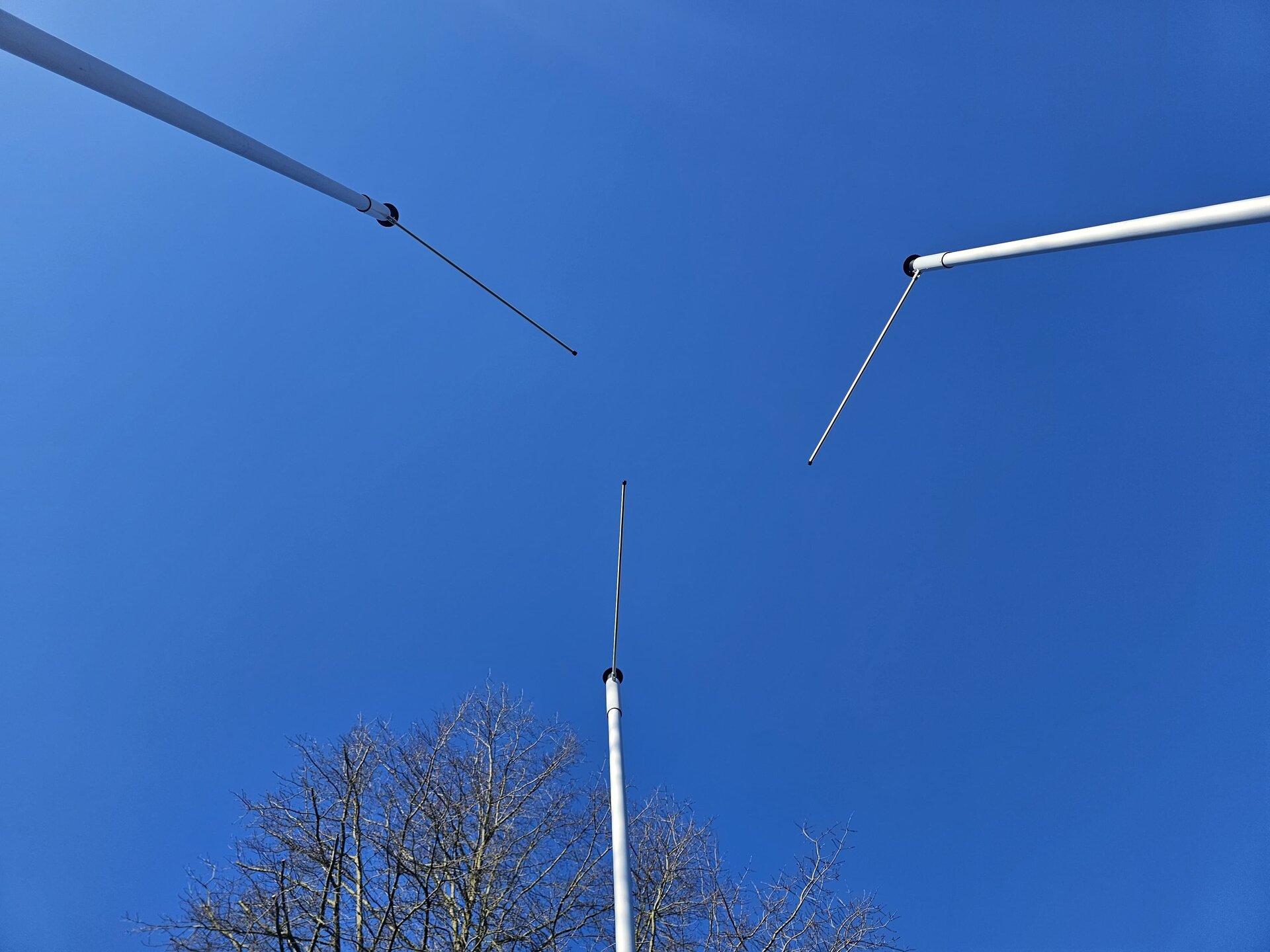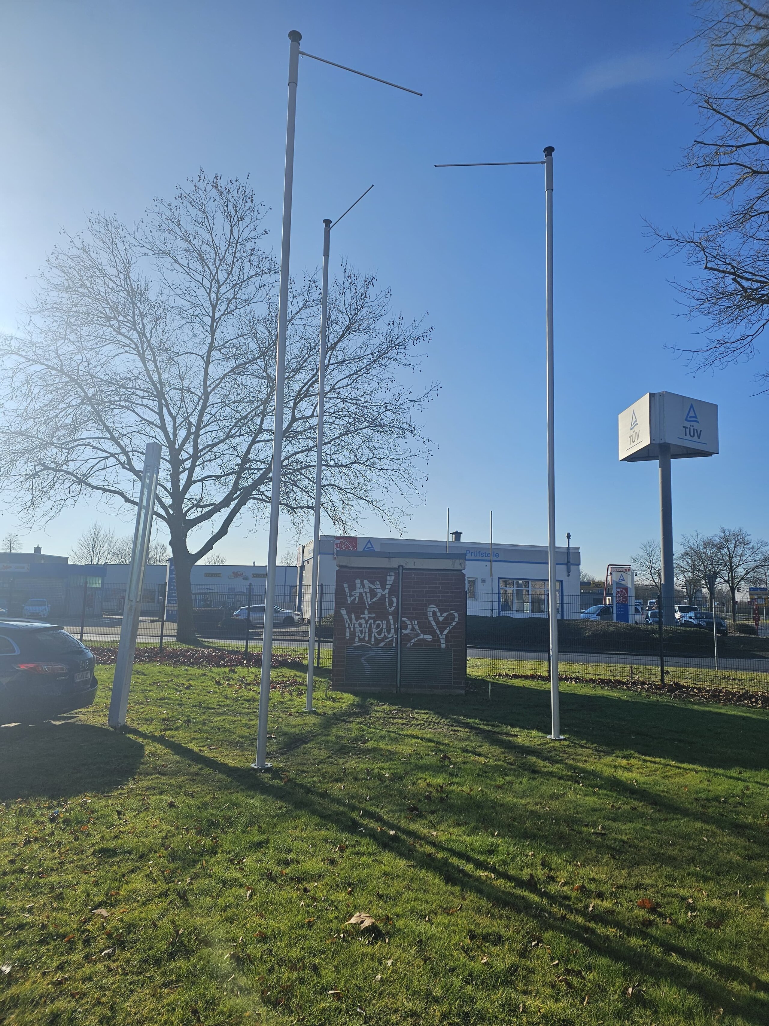 Auf dem Rasengelände wurden die Fahnenmasten im Dreieck angeordnet, wobei diese in ausreichendem Abstand aufgestellt wurden, um ein Aneinanderschlagen der Ausleger auszuschließen